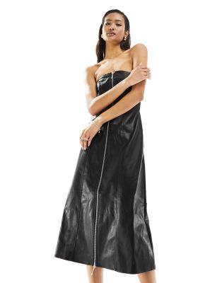 French Connection faux leather midi dress with zip detail in black