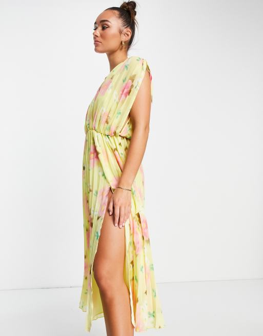 ASOS DESIGN pleated wrap front midi dress in yellow floral ASOS