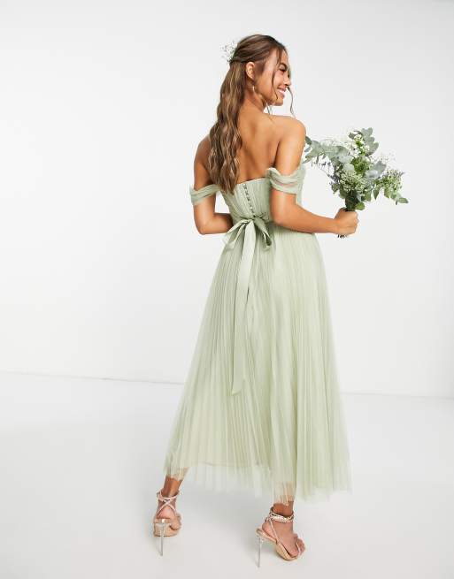 ASOS DESIGN Bridesmaid off shoulder tulle midi dress with tie back and pleated skirt in Sage