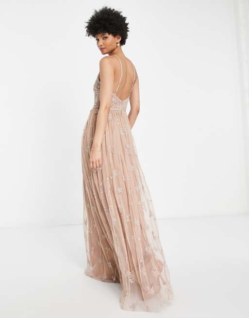 Beauut Tall Bridesmaid delicate embellished maxi dress with tulle skirt in taupe