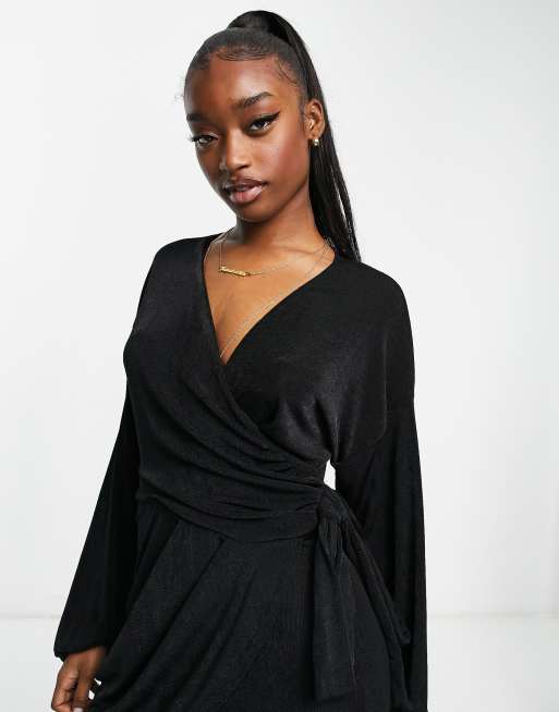 ASOS DESIGN wrap slinky blouson sleeve dress in black