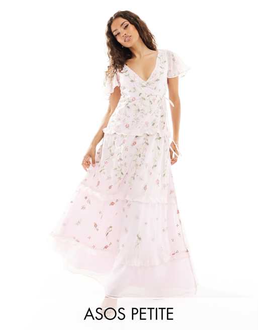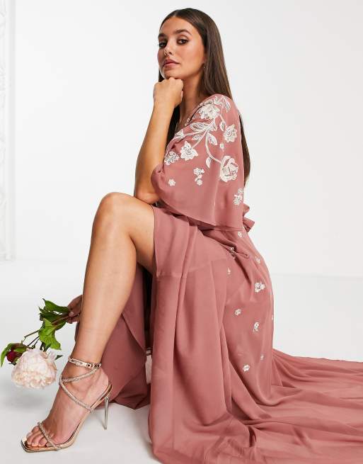 ASOS DESIGN Petite Bridesmaid flutter sleeve embellished wrap maxi dress with embroidery in light pink