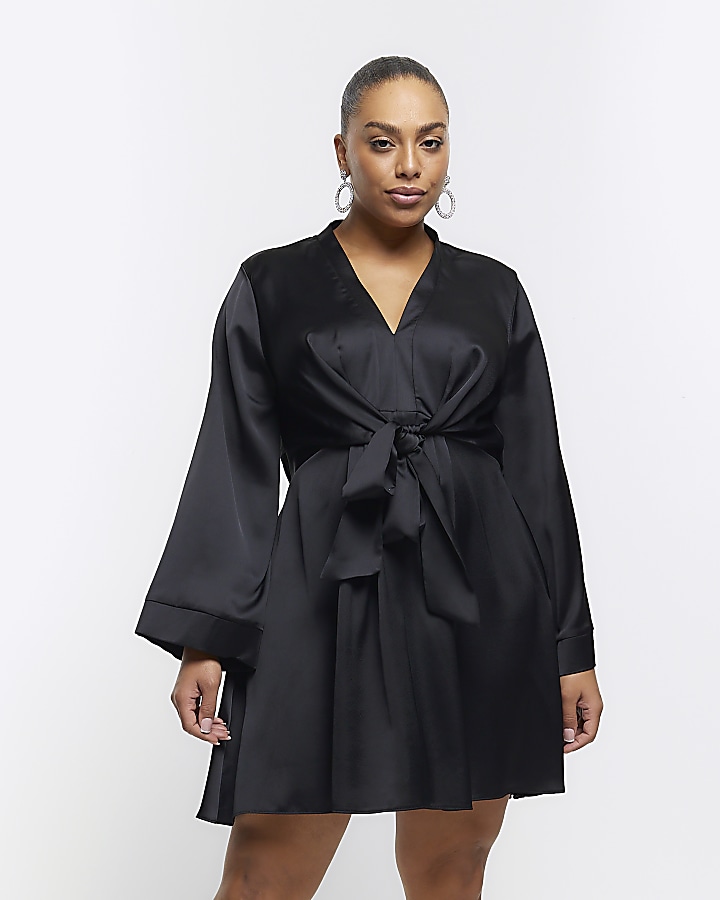 Black satin dress clearance plus size, Plus black satin long sleeve mini dress River Island clearance