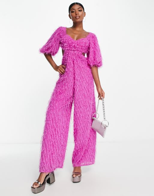 Pink clearance formal jumpsuits, ASOS DEISGN fluffy metallic tea jumpsuit in magenta clearance