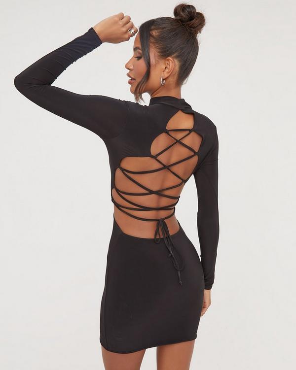 Long Sleeve High Neck Open Back Strap Detail Mini Bodycon Dress In Black Slinky