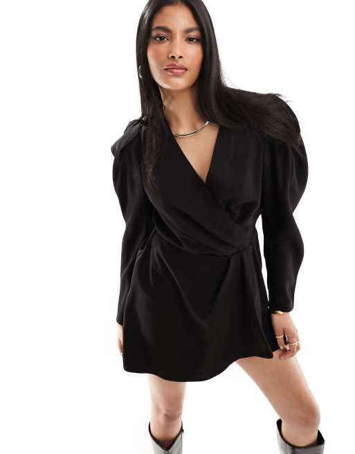 Other Stories long sleeve wrap mini dress with extended shoulders in black