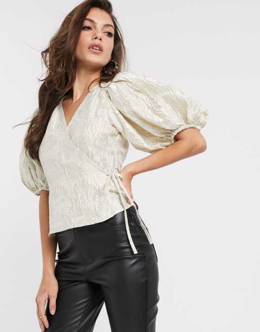 Other Stories jacquard puff sleeve wrap blouse in off white