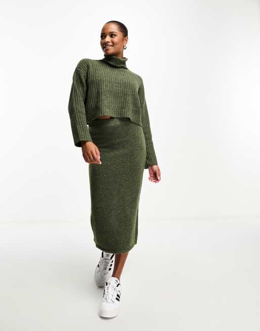 ASOS DESIGN Petite co ord knitted chunky rib midi skirt in khaki