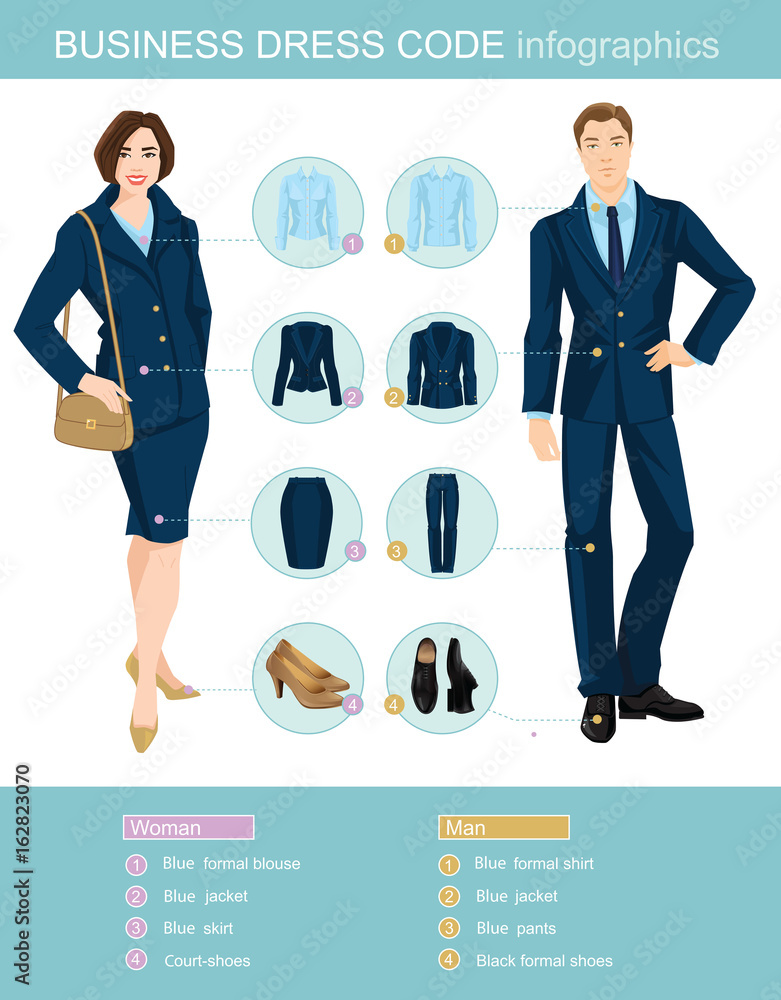 30 men and 2 clearance women dressed in black, Business dress code infographics. Man and woman in blue suit clearance