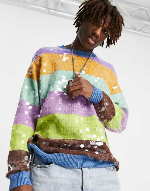 ASOS DESIGN knitted rainbow stripe jumper with all over sequin
