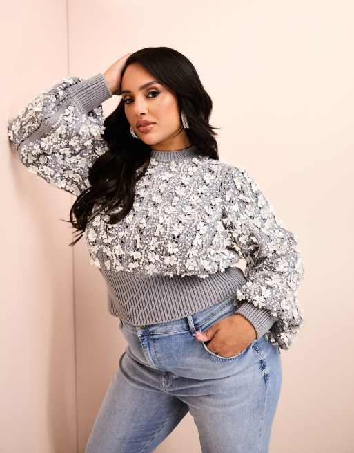 Asos clearance sequin jumper, ASOS LUXE Curve embellished knitted jumper with organza bow back clearance