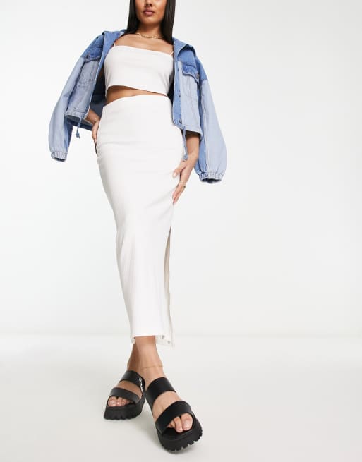 High Waist Elasticated Front Split Ribbed Midi Skirt White I Lily Lulu