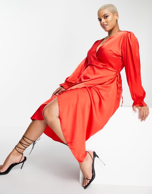 AX Paris Plus long sleeve wrap dress in red satin ASOS