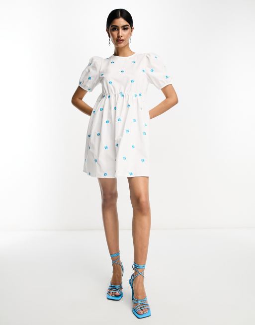 Y.A.S smock mini dress with embroidered blue flowers in white