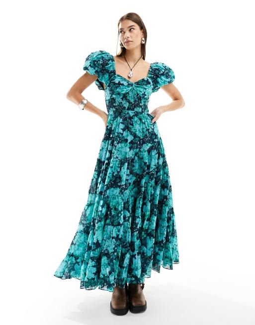 Free People puff sleeve floral print tiered midaxi dress in blue