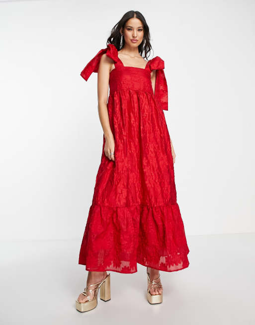Sister Jane tiered maxi dress in red jacquard with bow straps
