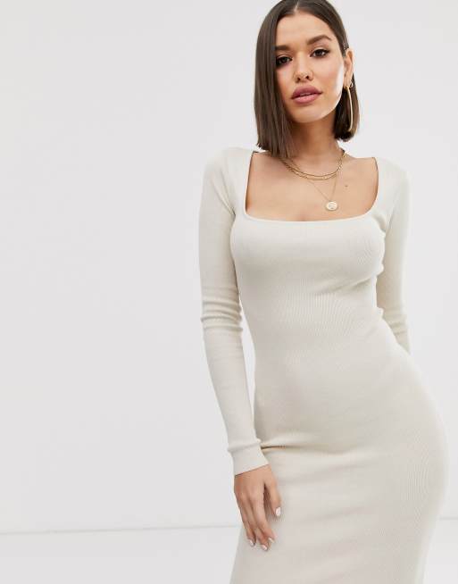 Square neck fitted clearance dress, Missguided knitted midi dress with square neck in cream clearance