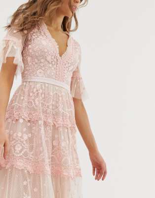 Needle & thread embroidered maxi clearance dress with flutter sleeve in rose