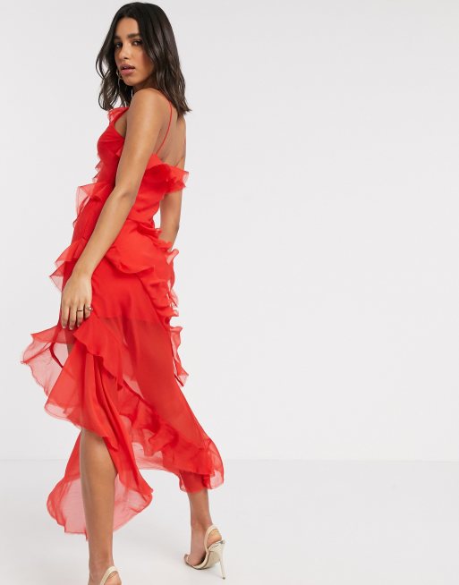 Red Chiffon Frill Detail Plunge Midaxi Dress PrettyLittleThing