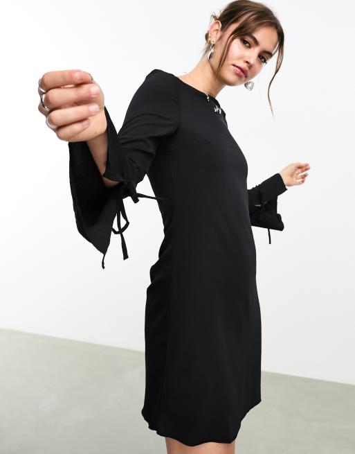 Monki boat neck long sleeve mini dress with trumpet sleeves in black