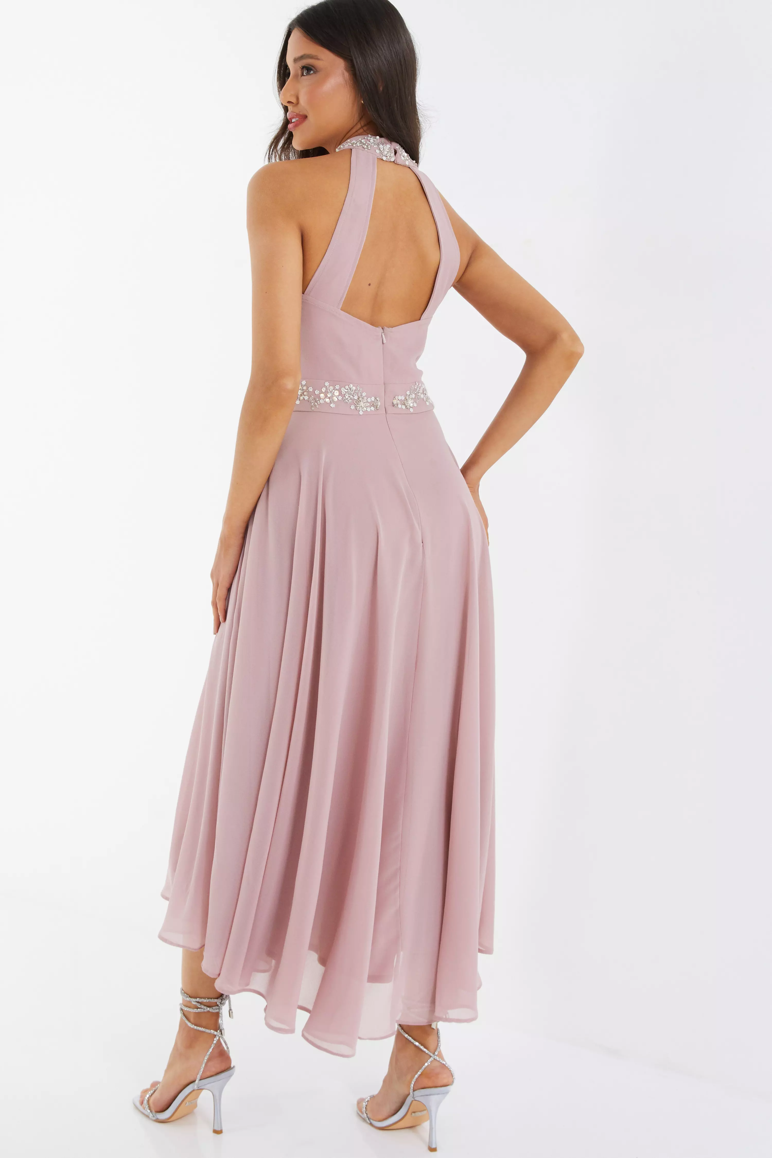 Pink Embellished Chiffon High Neck Midaxi Dress