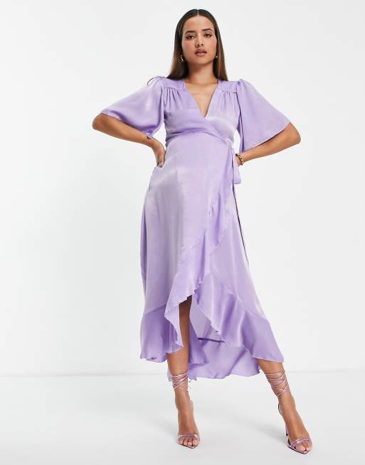Flounce London Maternity wrap front midi dress with flutter sleeves in lilac satin