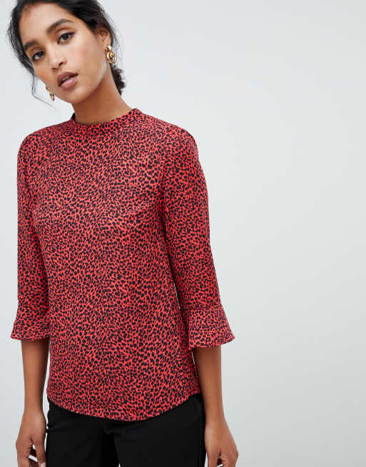 Oasis blouse with flute sleeves in red leopard print ASOS