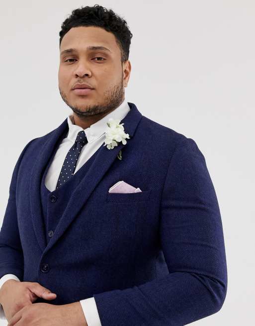 Asos clearance plus suits, ASOS DESIGN Plus wedding skinny suit jacket in blue wool blend herringbone clearance