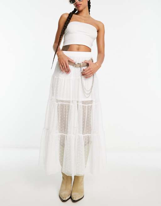 ASOS DESIGN festival sheer dobby mesh tiered maxi skirt in ivory
