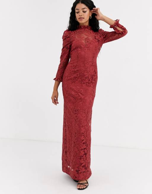 Rust lace maxi clearance dress, Zapaka Women Rust Dots Chiffon Long Wedding Guest Dress Spaghetti clearance