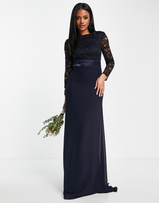 Missguided clearance bridesmaid navy, TFNC Bridesmaids chiffon maxi dress with lace scalloped back and long sleeves in navy clearance