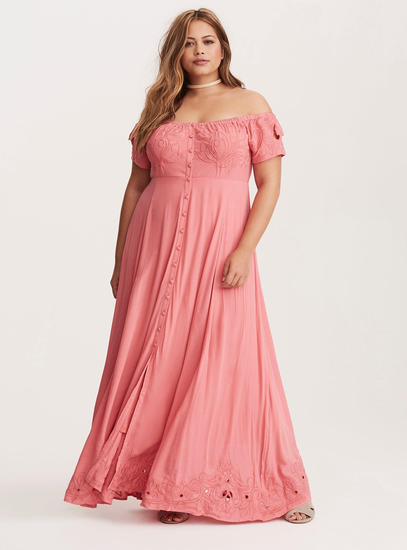 Plus Size Coral Embroidered Off Shoulder Maxi Dress Short