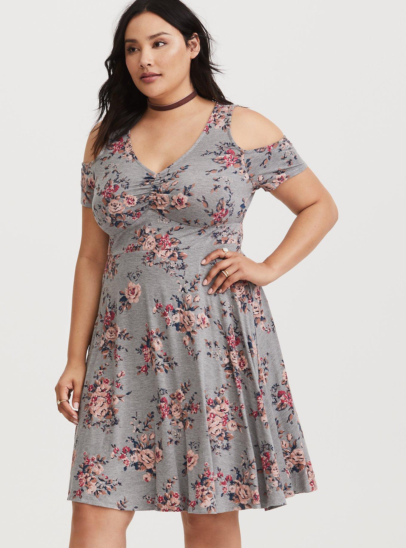 Torrid clearance gray dress, Plus Size Grey Floral Jersey Cold Shoulder Mini Dress Torrid clearance