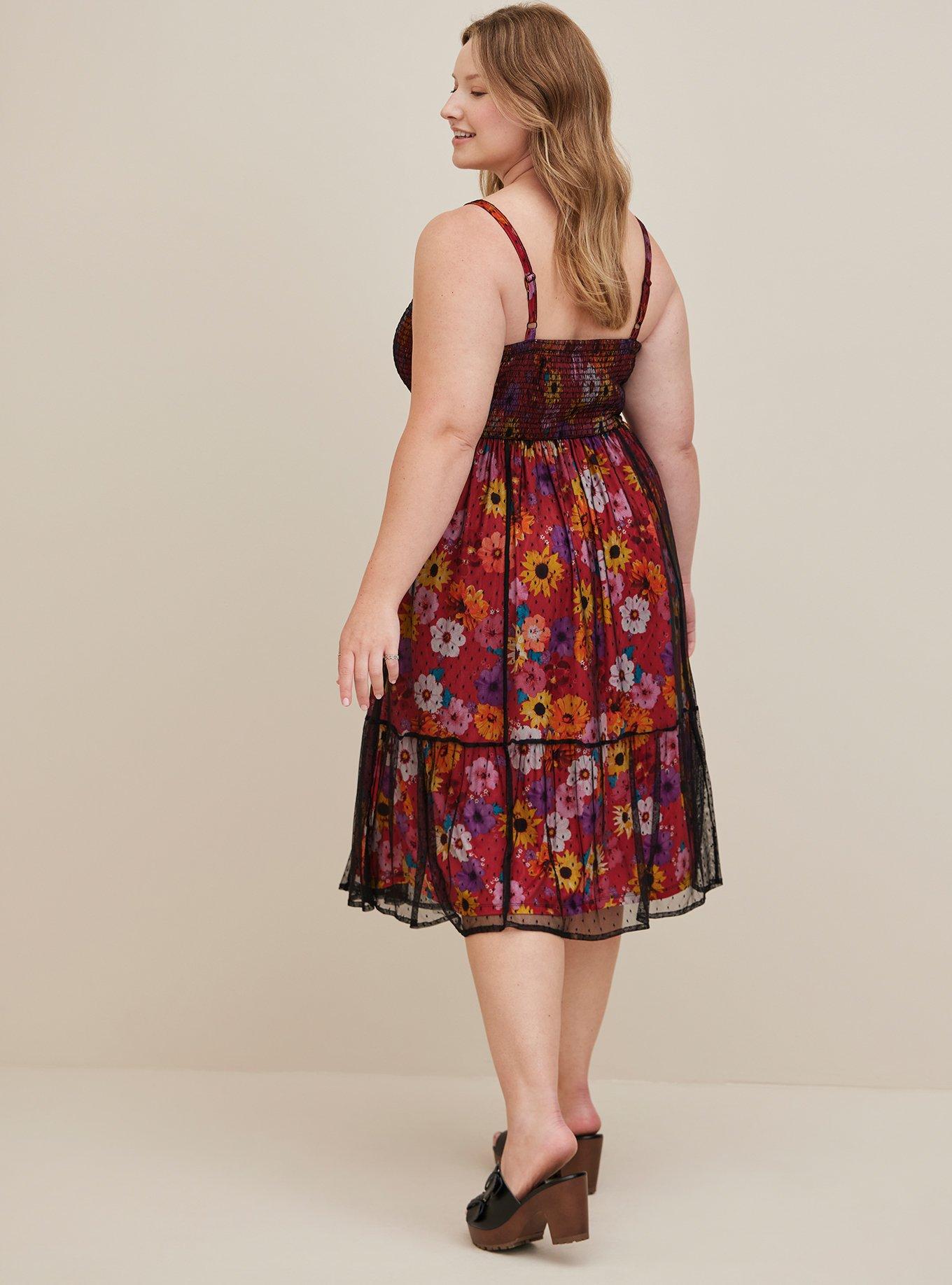 Plus Size Smocked Tiered Midi Dress Swiss Dot Mesh Floral Red