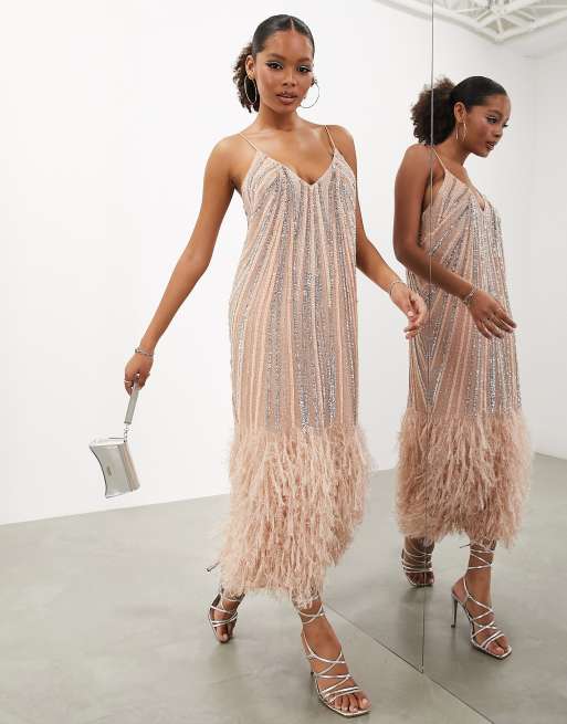 ASOS EDITION embellished v neck cami midi dress with faux feather