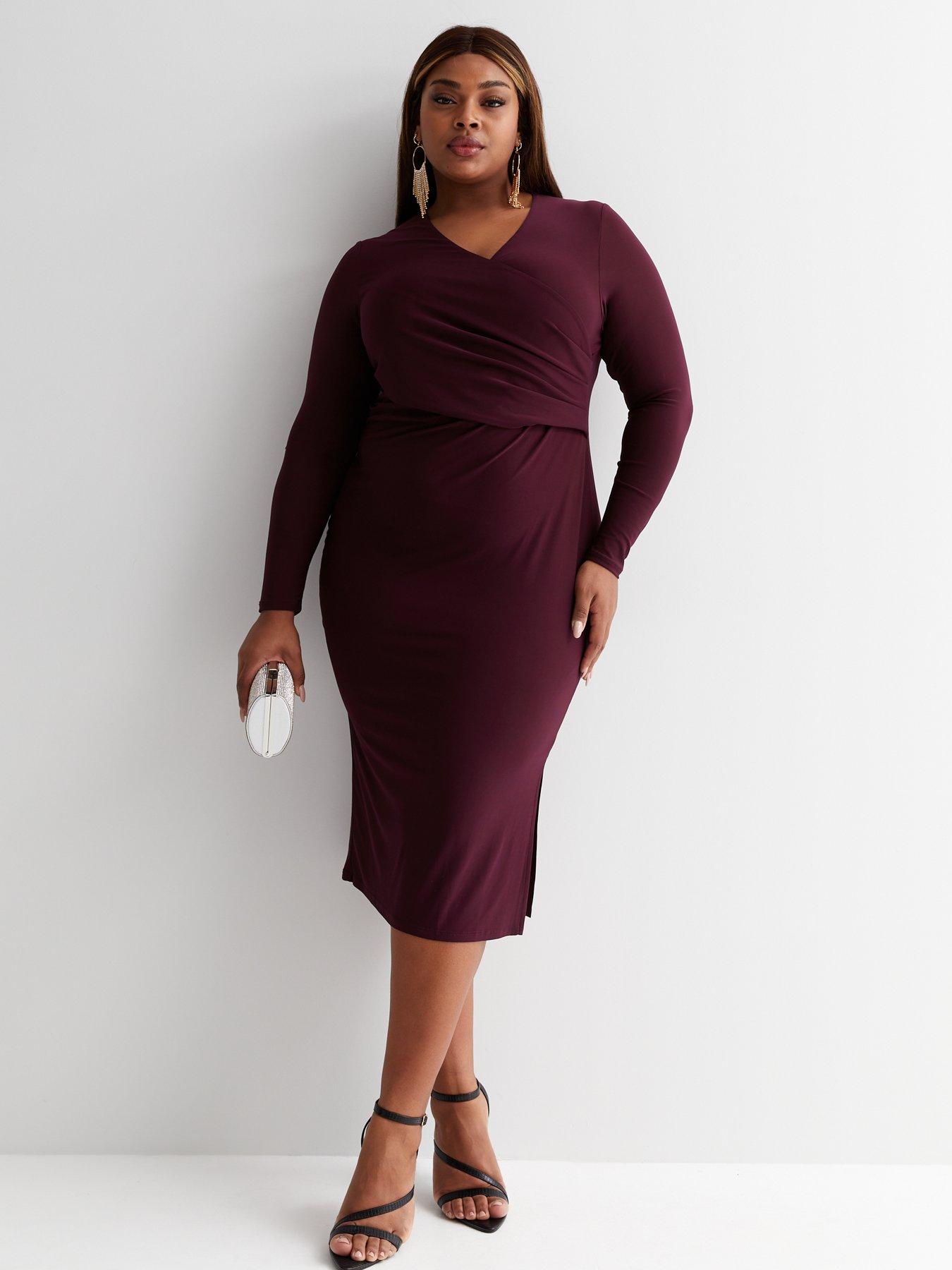 New Look Curves Dark Purple V Neck Long Sleeve Midi Wrap Dress