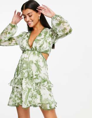 ASOS DESIGN long sleeve mini dress in floral print with cluster