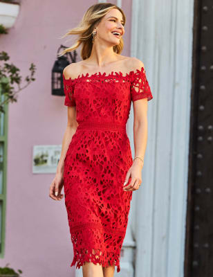 Lace Bardot Midi Column Dress SOSANDAR M S
