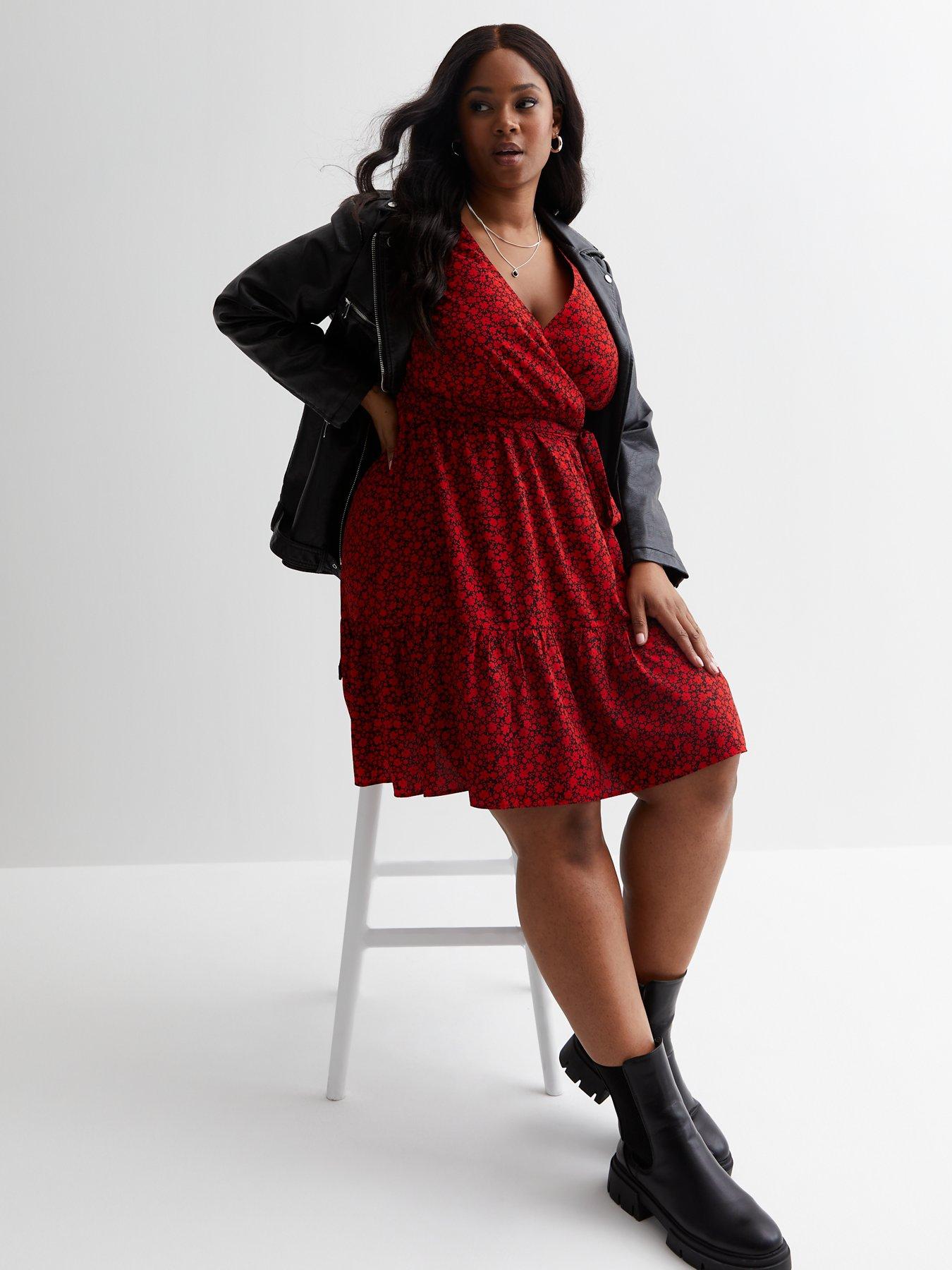 New Look Curves Red Floral Frill Sleeve Wrap Mini Smock Dress