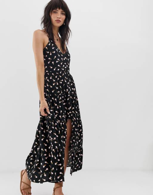 Band of Gypsies button front tiered midaxi dress in black floral print