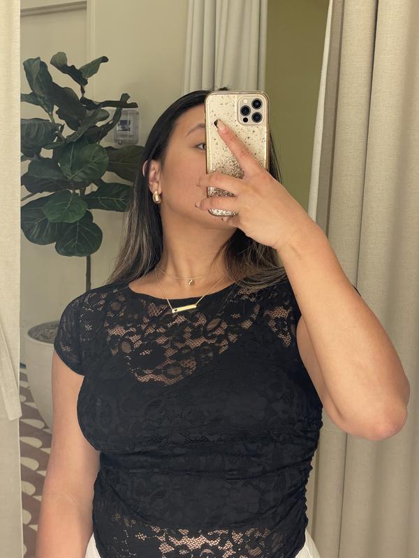 White lace crop clearance top short sleeve, Short Sleeve Ruched Lace Top White Dynamite clearance