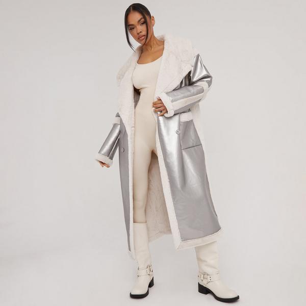 Oversized Borg Contrast Detail Maxi Aviator Coat In Silver