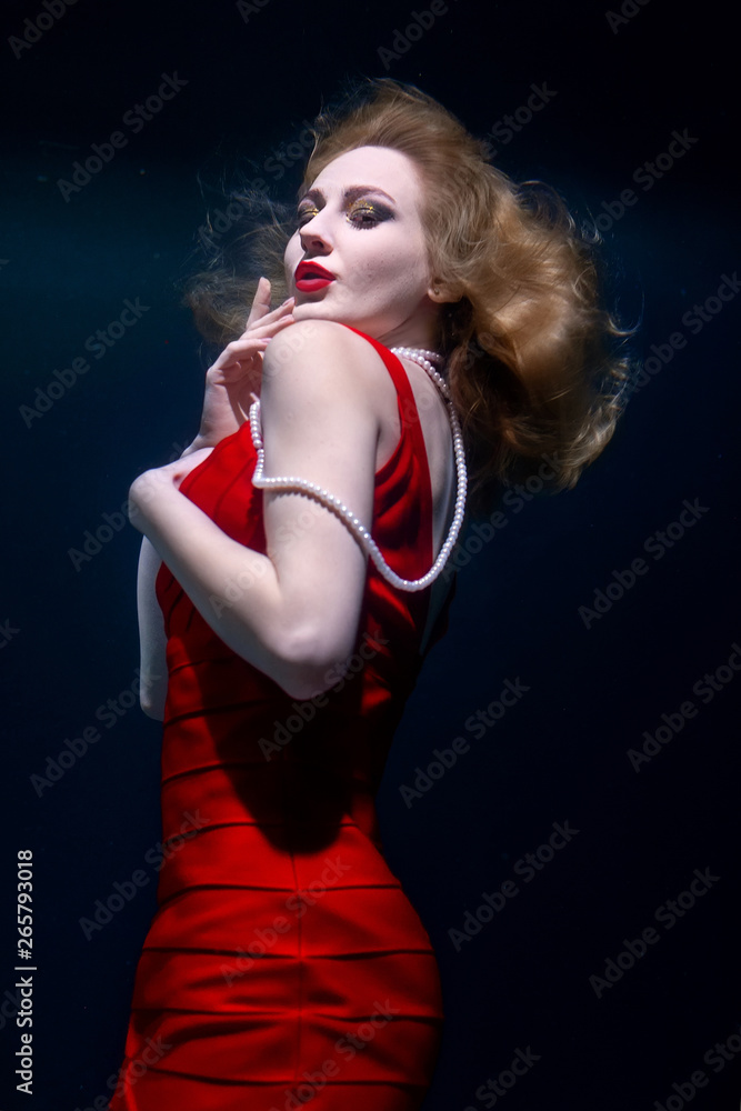 blonde girl with flowing hair in red dress and with pearls