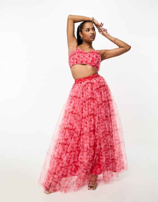 Lace Beads Petite Exclusive crop top and tulle maxi skirt set in red