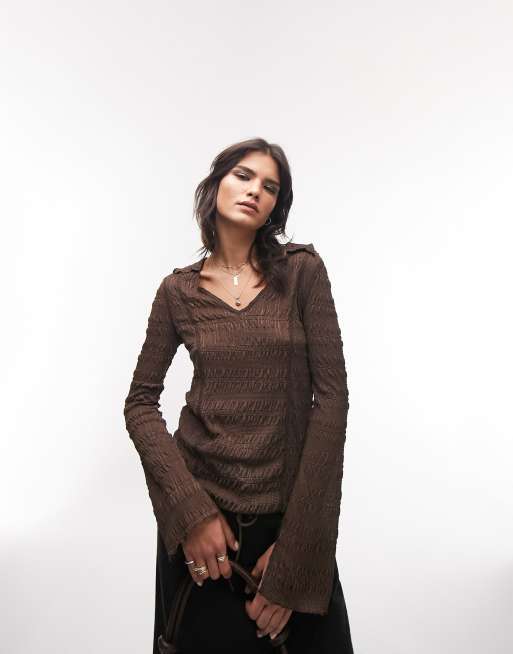 Topshop mesh v neck collared long sleeve top in brown ASOS