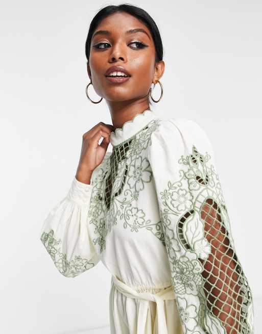 High neck work clearance dress, ASOS DESIGN high neck cutwork belted mini dress in stone with green detail clearance