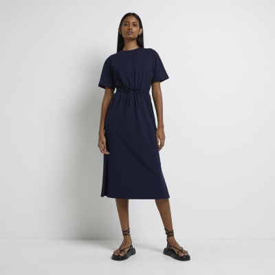 Navy drawstring jersey t shirt midi dress River Island