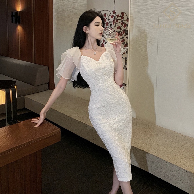 Plain white tight clearance dress, Elegant Plain Bodycon Lace Embroidery Dress For Dinner Woman Mid clearance