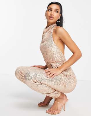 Club L London Sequin High Neck Cuffed Detail Jumpsuit In Rose Gold ModeSens