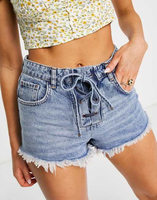 Stradivarius denim hotpant with lace up waist in deep blue wash